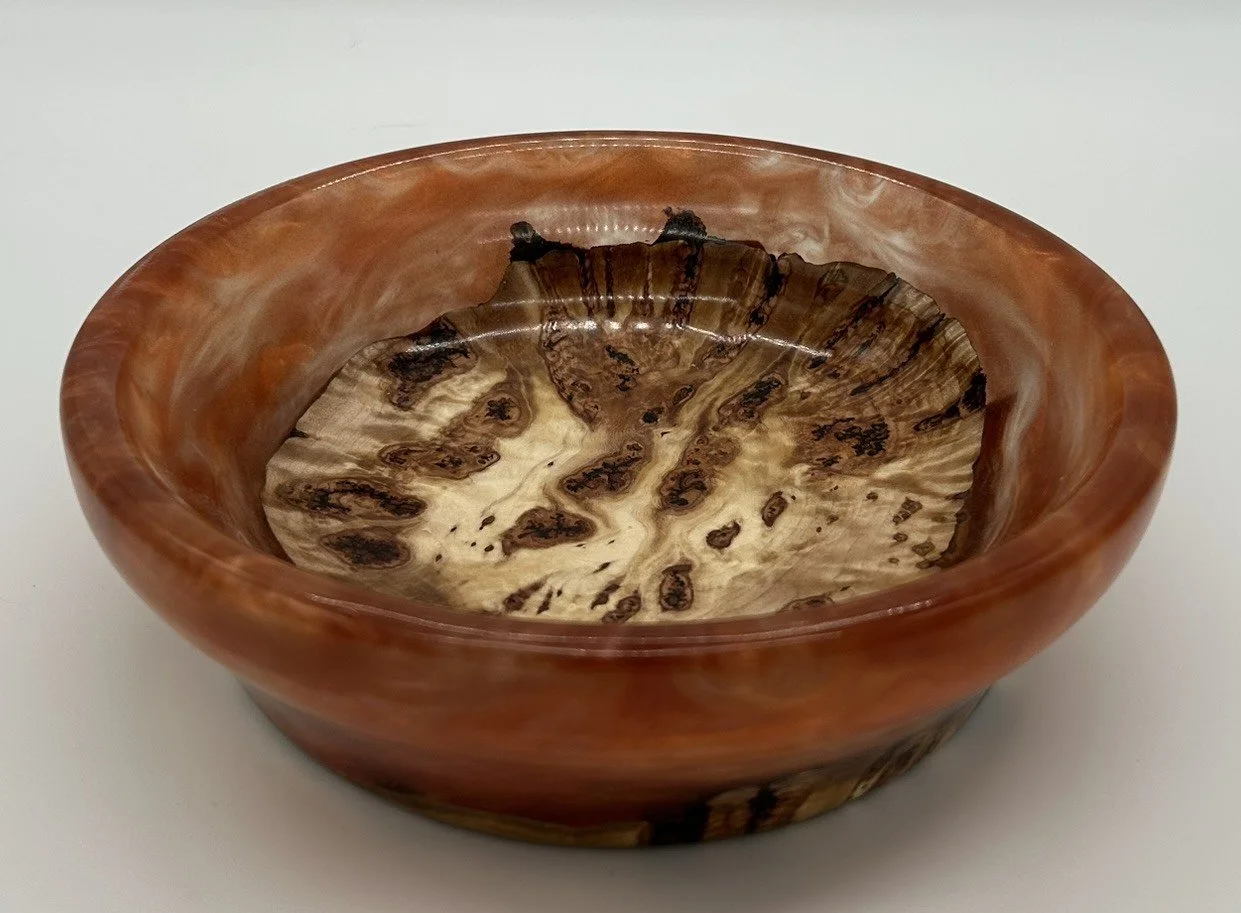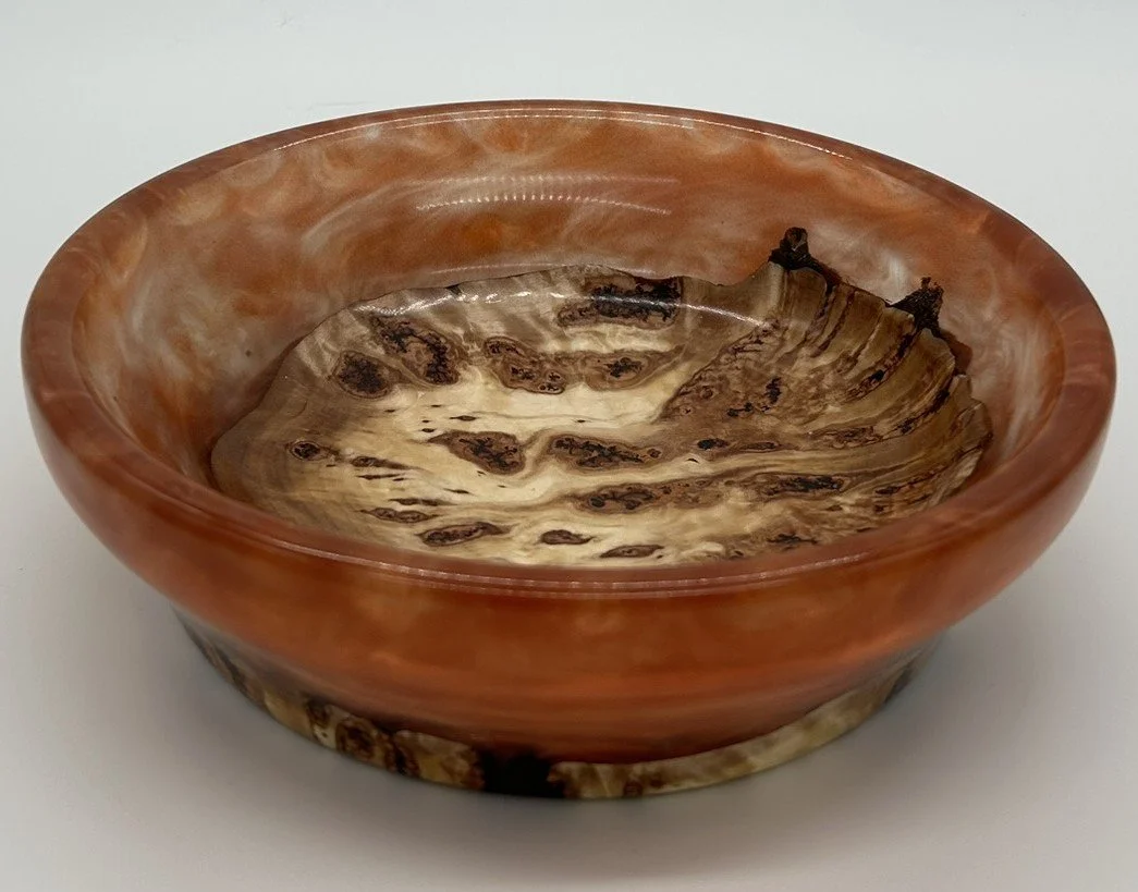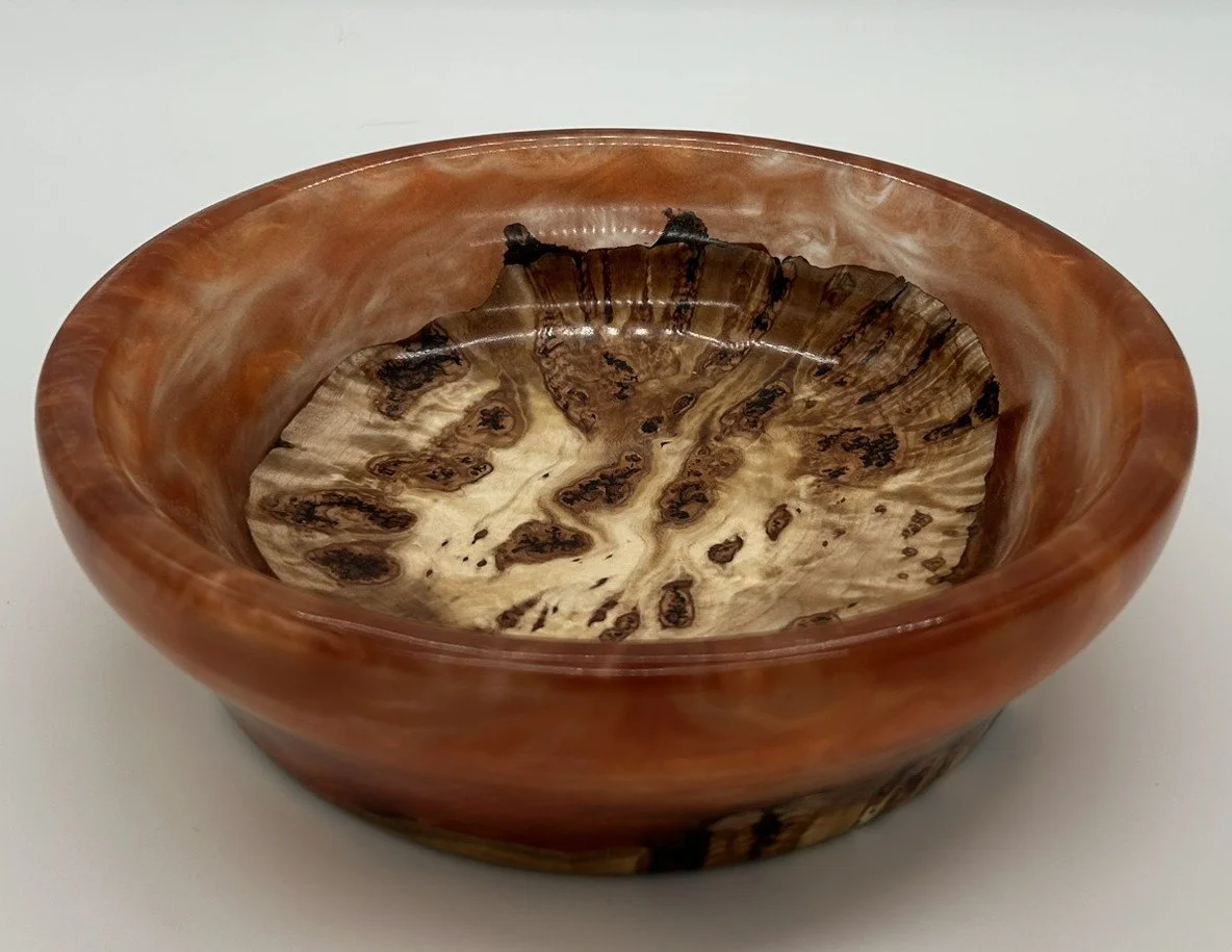 In this stunning handcrafted bowl made from Maple Burl and resin, brought to life on the lathe and finished to a brilliant polish. What makes this piece truly unique is its hidden feature—it glows under black light!