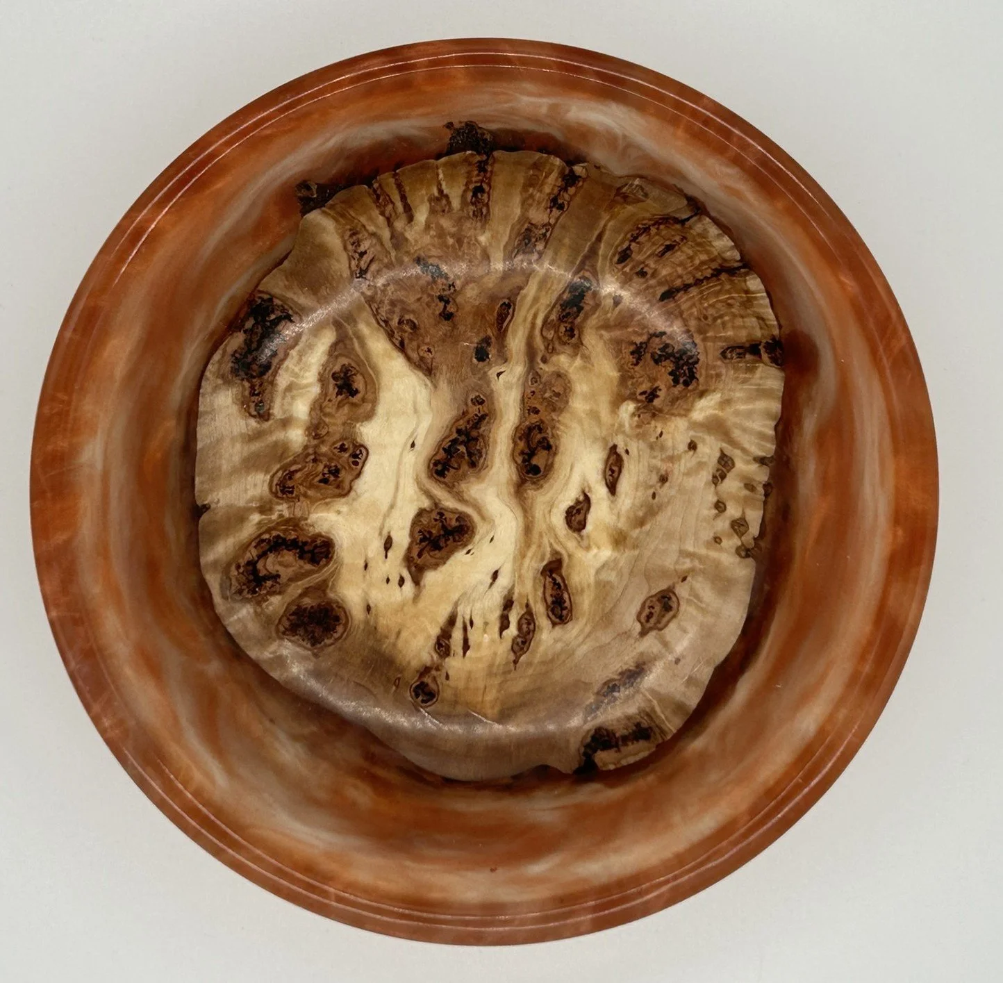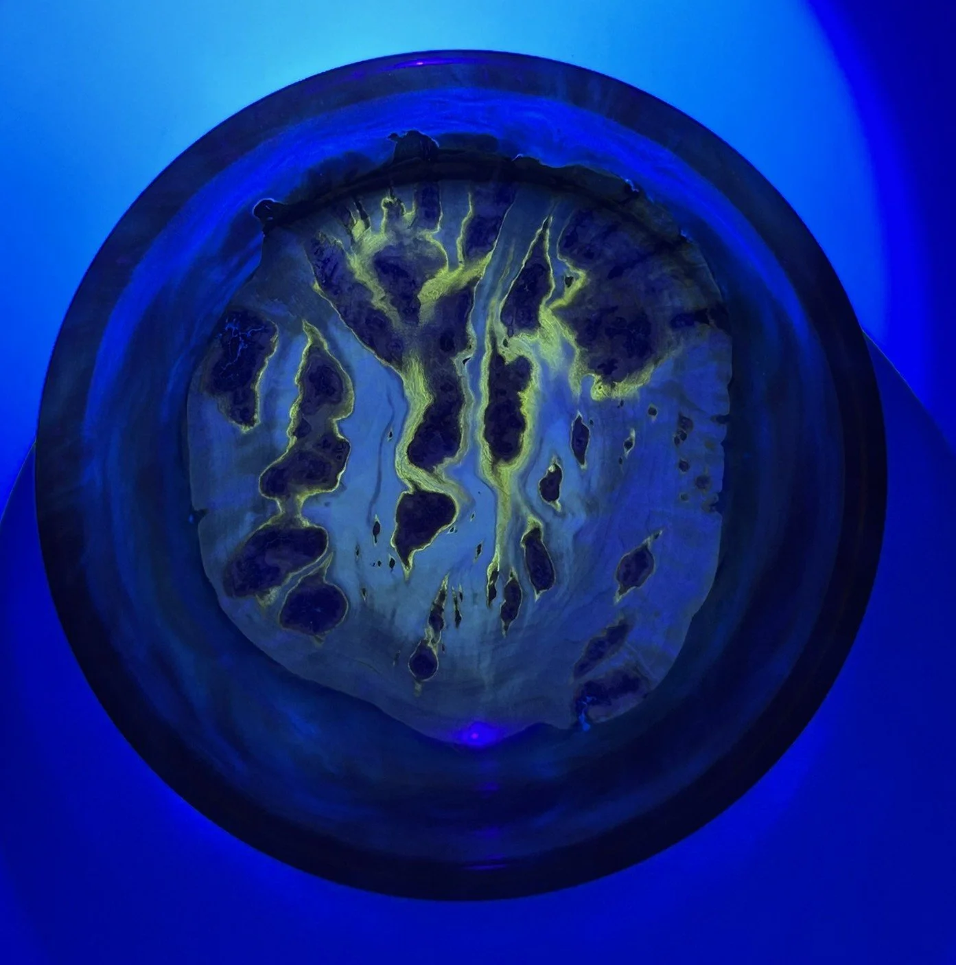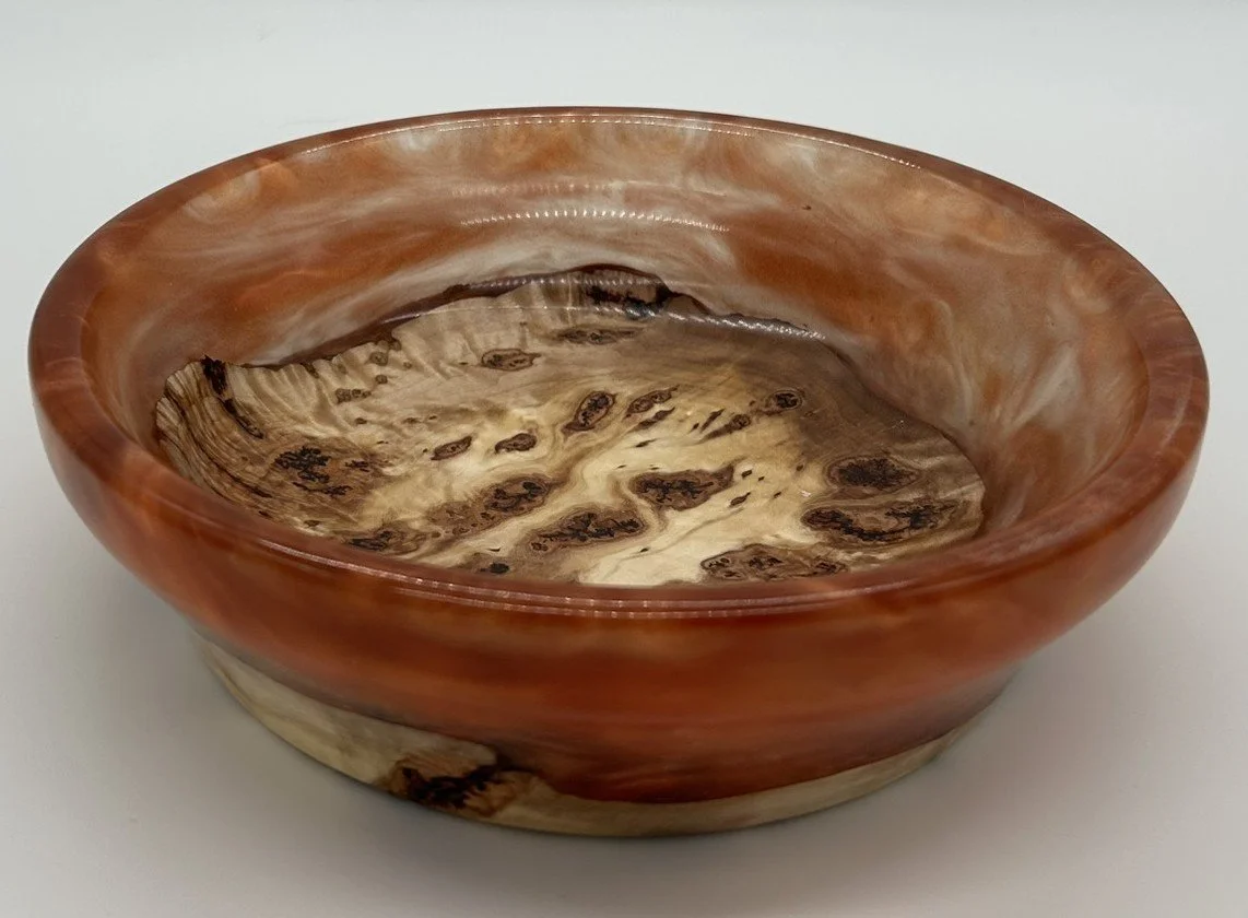 In this stunning handcrafted bowl made from Maple Burl and resin, brought to life on the lathe and finished to a brilliant polish. What makes this piece truly unique is its hidden feature—it glows under black light!