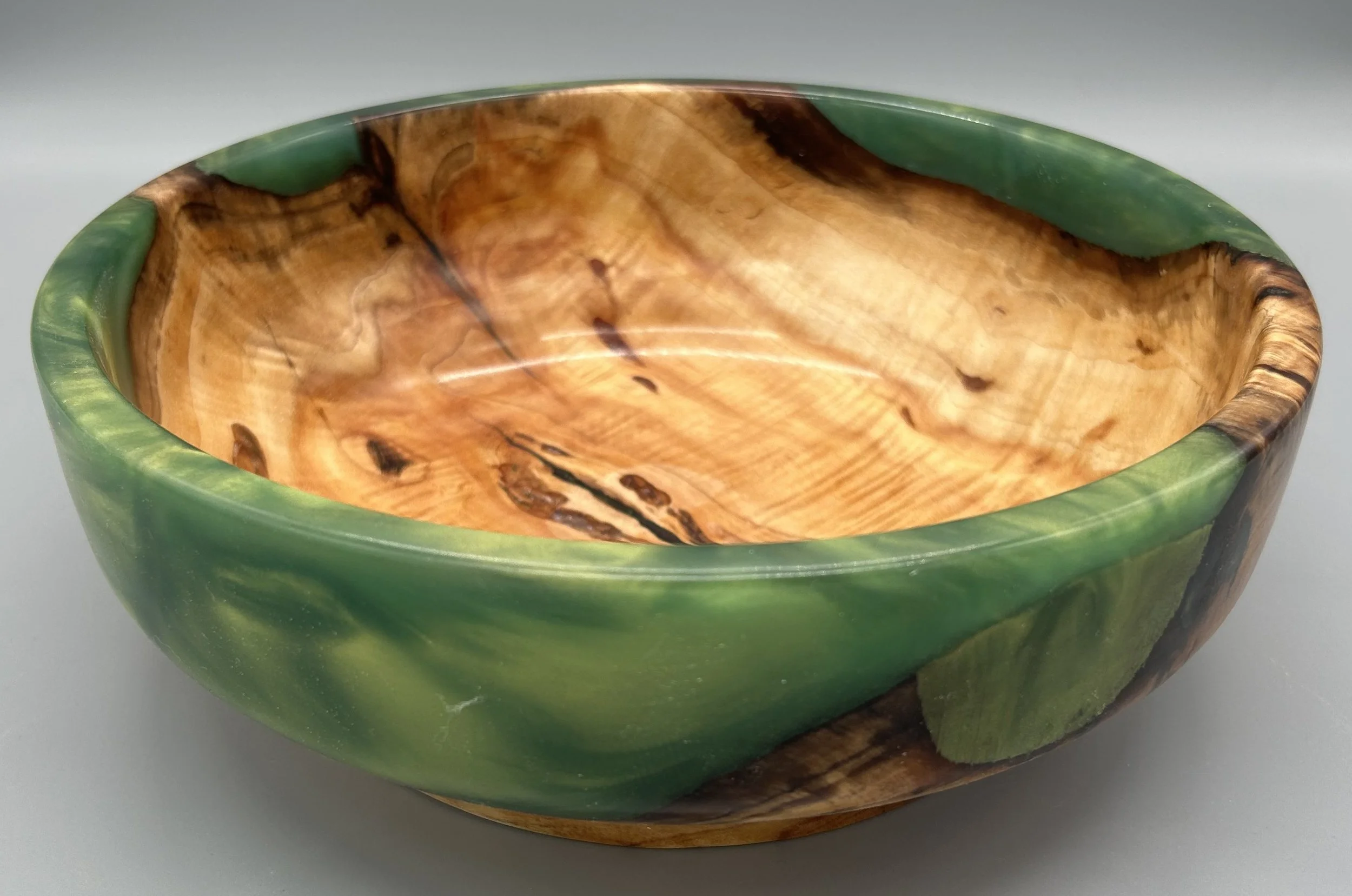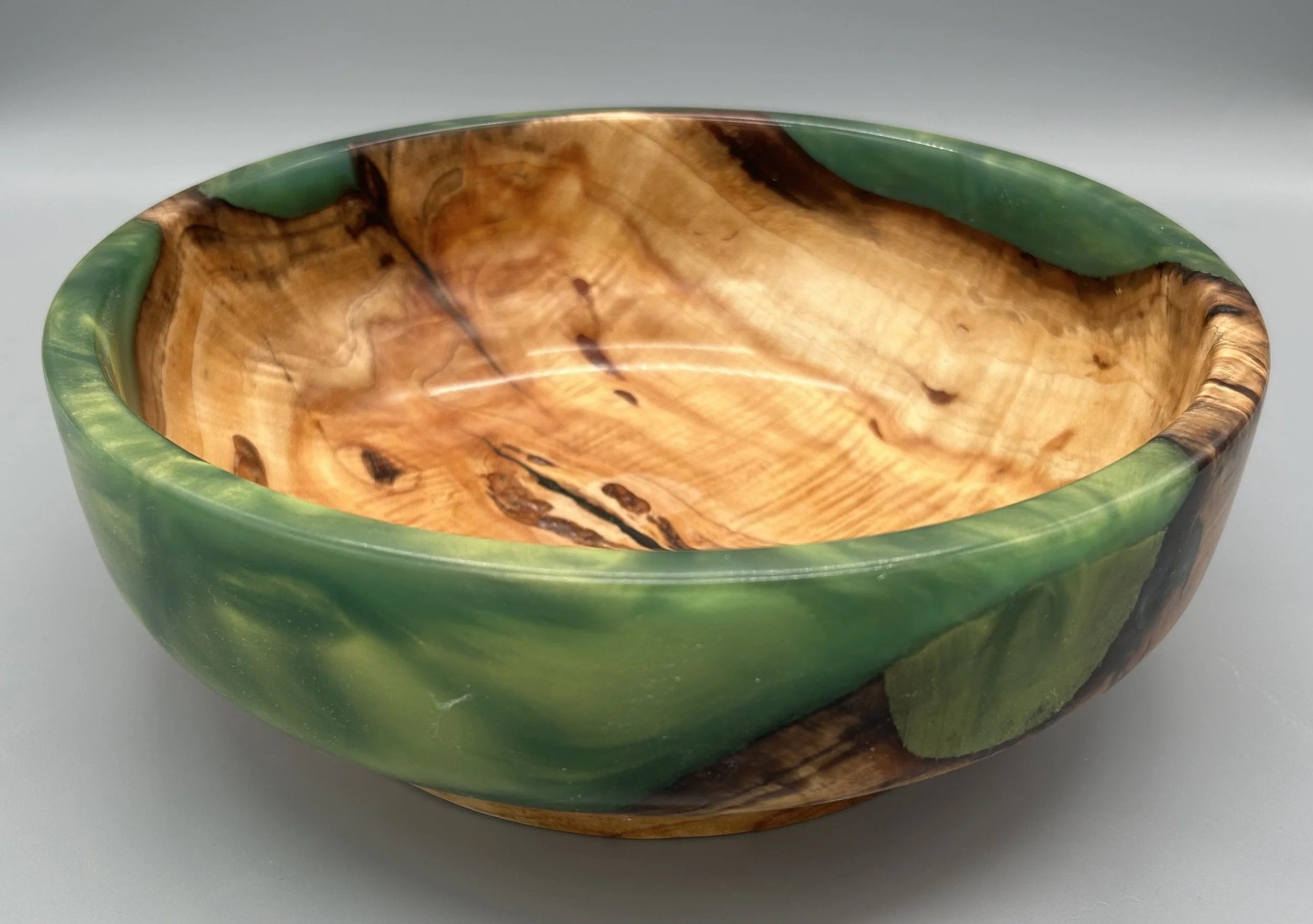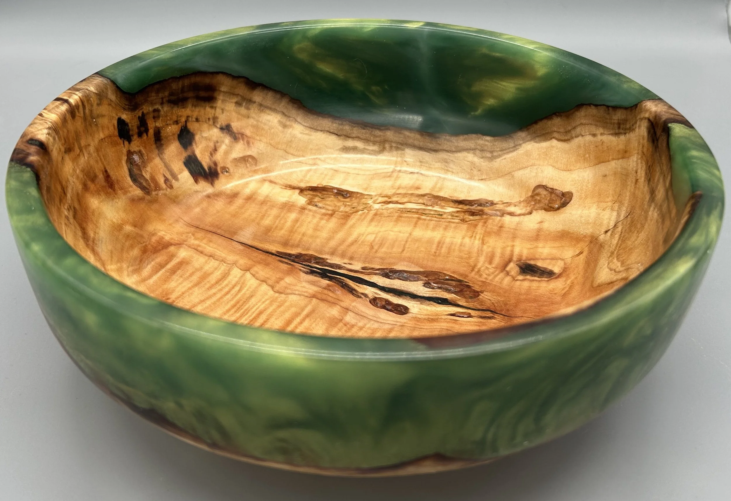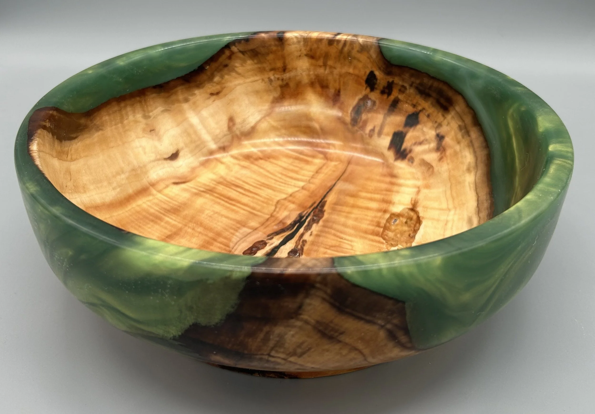 Spalted Maple and Green Resin BowlWatch as I turn this chunk of spalted maple wood that’s cast in green resin into something spectacular.